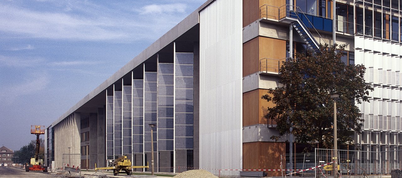 Along the Volmarstraße, behind the head office of the WISTA, there is an imposing façade of 200 metres. Of the threefold parallel repetition in meander-form, so far only two wings (450 m) have been built. Base and roof zones as elements running through the structure keep the whole building architectonically together.