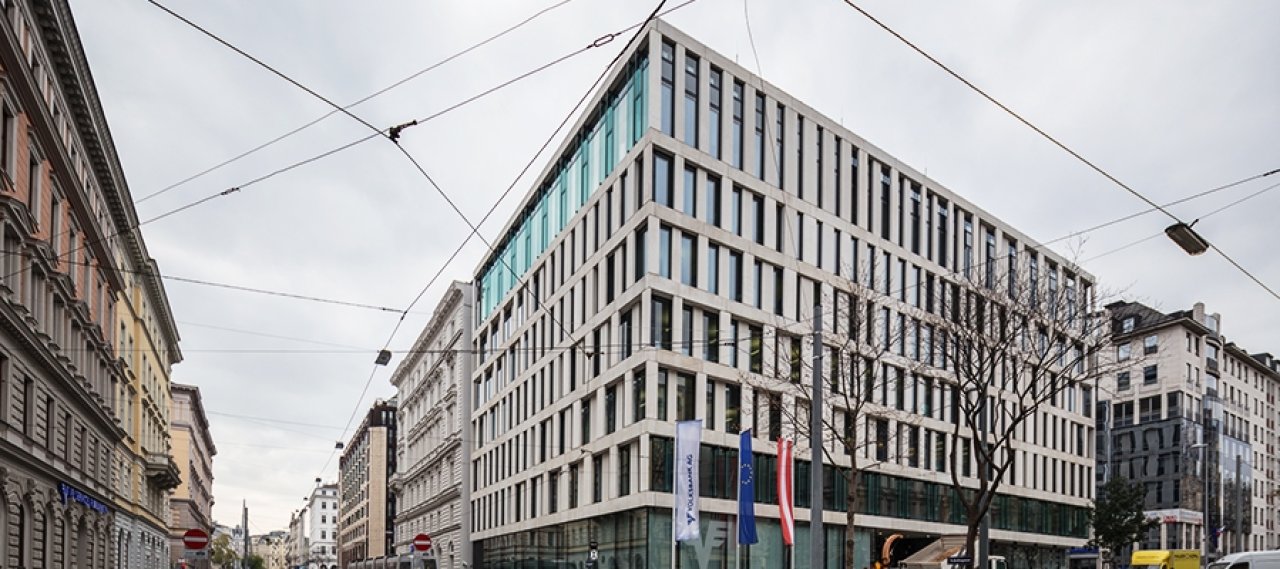 The headquarters of the Austrian Volksbank AG in Vienna is planning to be rebuilt and expanded. The existing property was originally equipped with four buildings. While the two building parts which are at the side next to the street could be preserved, the two other buildings have been demolished to be entirely rebuilt. The C-shaped new building has eight floors and four basements and is connected to the Westside of the existing building, also build in a C-shape. Out of the new created court yard 6 additional 22 m high towers with different access functions as well as seminar and conference rooms are growing. Office usage is planned in the new 50 m by 43 m building. A cafe, the entrance hall and seminar rooms are on the ground and first floor. Storage rooms, building services and the underground parking are located on the basement floors.