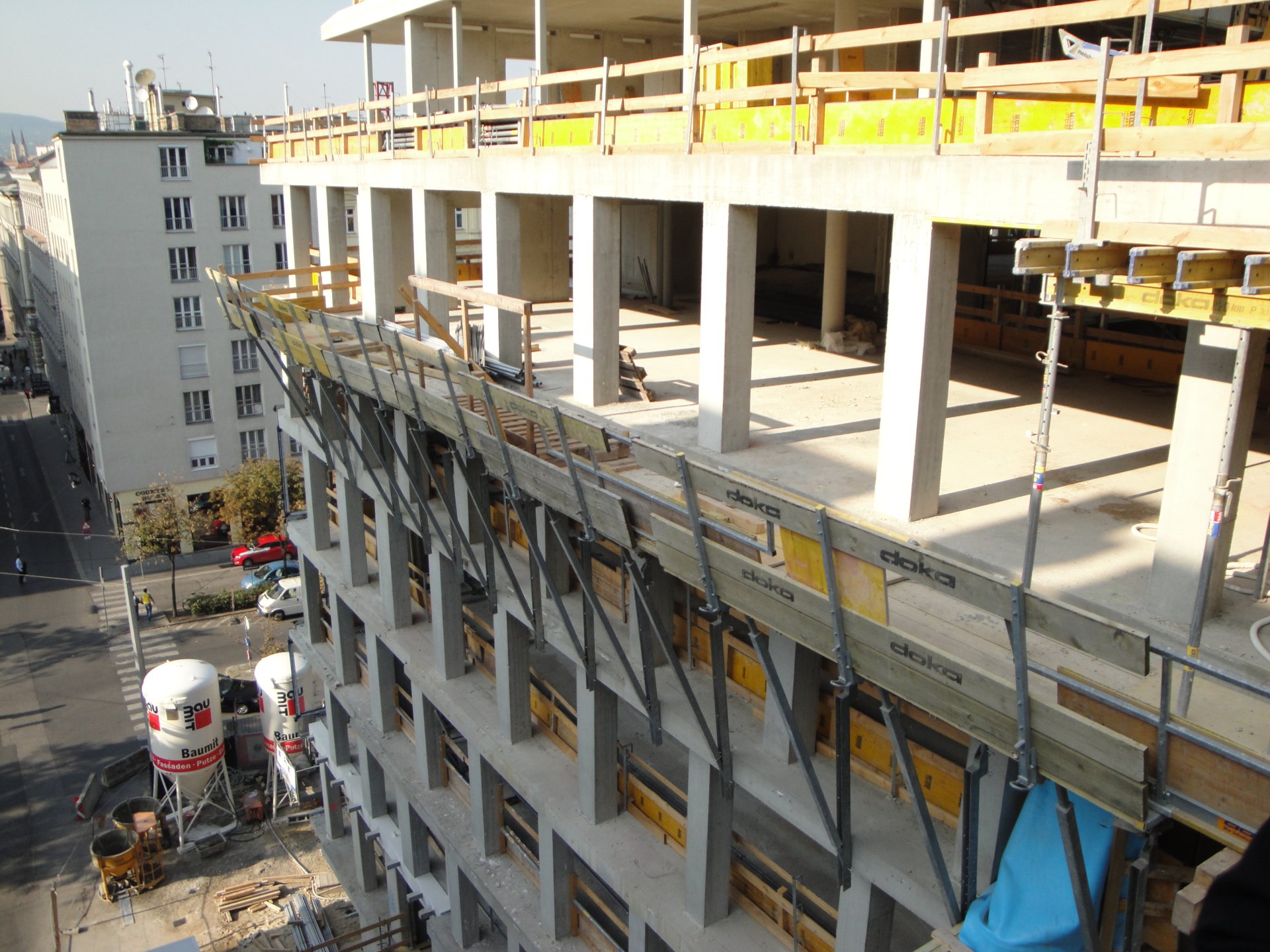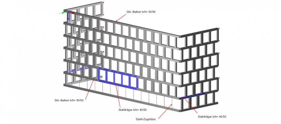 The structural components of the new buildings are built in reinforced concrete and steel. The front façade spans over the entrance area. It functions as Vierendeel truss, where the mullions and transoms are offset from one another. The attic is designed as a perimeter, cantilevered ring. In the area of the existing building the new reinforced concrete columns are integrated into the existing walls.
