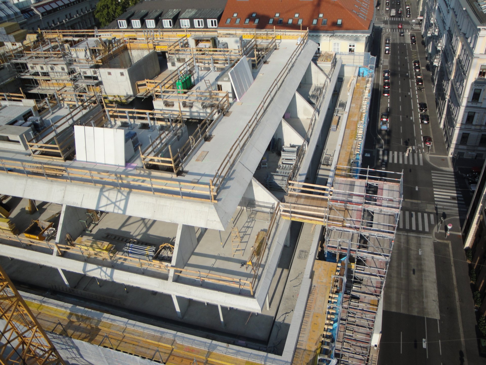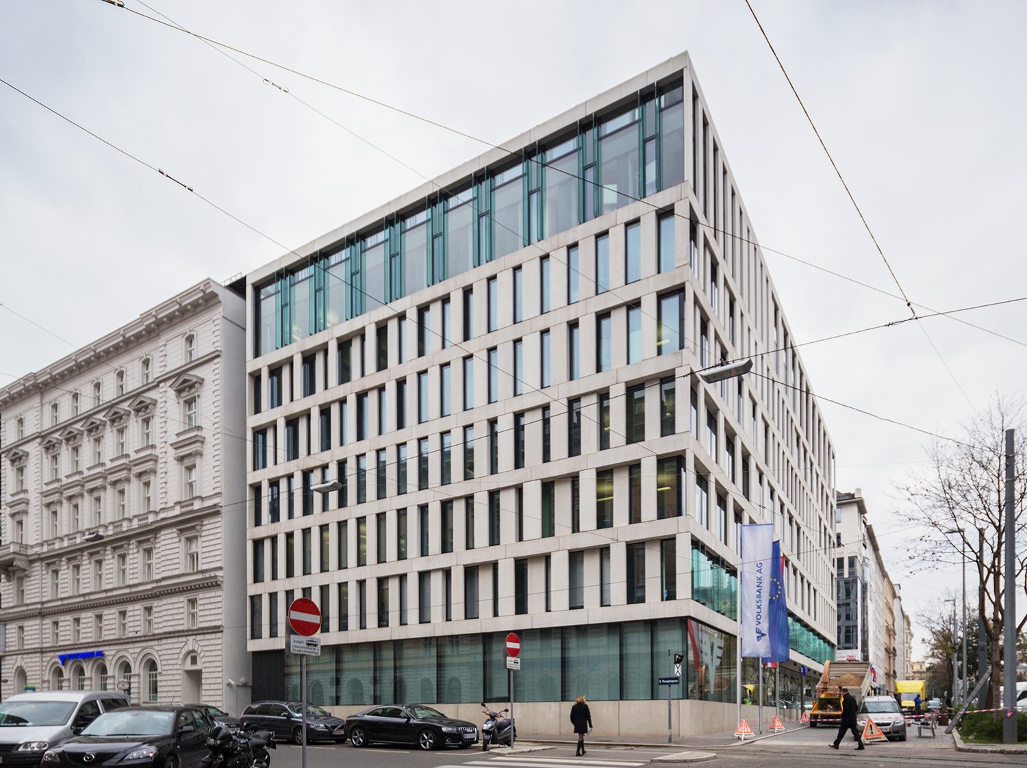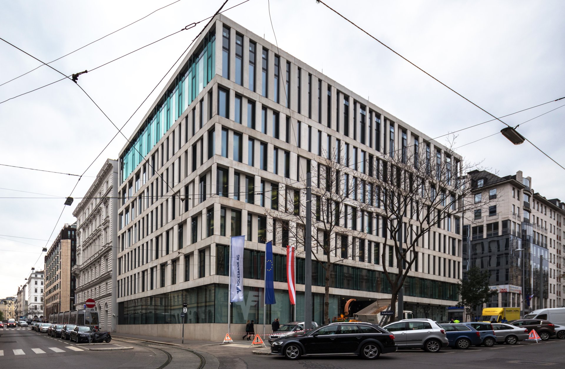 The headquarters of the Austrian Volksbank AG in Vienna is planning to be rebuilt and expanded. The existing property was originally equipped with four buildings. While the two building parts which are at the side next to the street could be preserved, the two other buildings have been demolished to be entirely rebuilt. The C-shaped new building has eight floors and four basements and is connected to the Westside of the existing building, also build in a C-shape. Out of the new created court yard 6 additional 22 m high towers with different access functions as well as seminar and conference rooms are growing. Office usage is planned in the new 50 m by 43 m building. A cafe, the entrance hall and seminar rooms are on the ground and first floor. Storage rooms, building services and the underground parking are located on the basement floors.