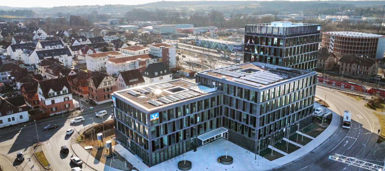 Volksbank Mittlerer Neckar eG has a new building complex on Bahnhofstraße in Wendlingen am Neckar. The architectural design features an ensemble of three staggered buildings that are slightly recessed from one another while maintaining a cohesive appearance. The two smaller structures house training and conference rooms, providing space for 240 employees. The taller building primarily serves the Wendlingen police. This new complex places a strong emphasis on energy and resource conservation.