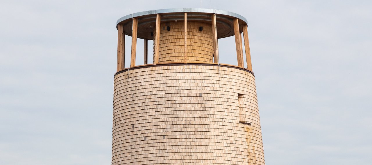The observation tower is 18 metres high and was essentially planned as a timber structure. A viewing platform at a height of approximately 14 metres can be accessed by a lift inside the tower or by a circular steel spiral staircase. The façade consists of 12,500 timber shingles made of Alaskan cedar.