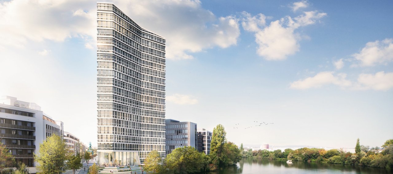 The up to 70-metre-high high-rise with 18 storeys is to be built in the newly developed district at Offenbach harbour as an architecturally impressive office tower with gastronomy areas in the heart of the Rhine-Main region in Germany.