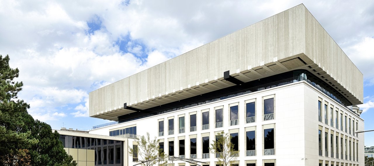 A distinctive aspect of the supporting structure design is integrating two separate building components: the existing structure and a new two-storey addition above it. The extension’s substantial cantilever is made possible by two-storey-high steel trusses positioned along the shorter sides of the inner courtyard, combined with a ring-shaped, point-supported steel truss anchored to the building shell on the fourth floor.