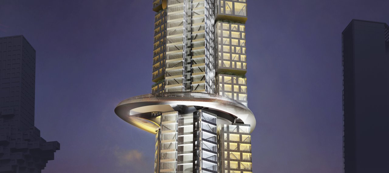 The concept of the hotel and residential building with a height of 333 m and consisting of a variety of construction elements generates a highly lively appearance, and individual clusters have been “planted on” to the solid Y-formed core without continuous supports. The alignments of the three tower wings correspond to the three most important visual axes of the master plan. The striking external “walkways” at windy heights are designed as steel structures.
