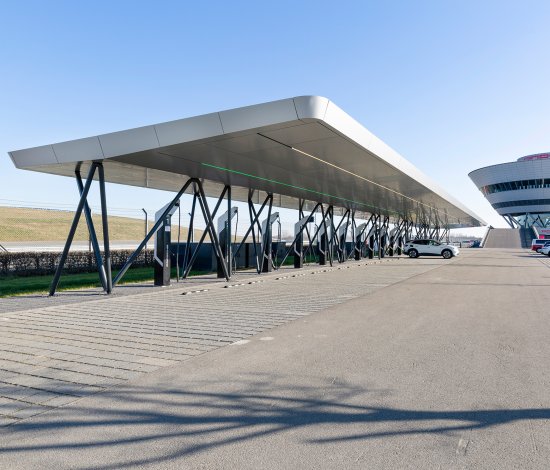 The station at the production site of a sports car manufacturer is open to the public and offers a comprehensive range of charging options for electric vehicles. The task was a great challenge to the extent that the existing technical infrastructure only allowed for a few irregular support points and support positions.
