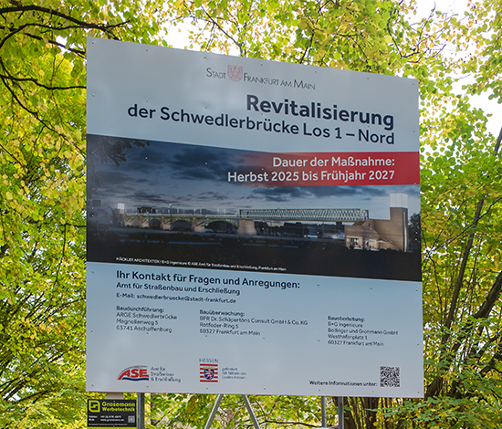 The starting signal was given at a press conference on 28 October in Ostpark, attended by our project manager Horst Peseke, together with Mäckler Architekten and representatives from the City of Frankfurt's ‘Amt für Straßenbau & Erschließung’. The revitalisation takes into account the historic status of the original bridge sections built between 1910 and 1913. The goal is to complete the bridge by summer 2028.