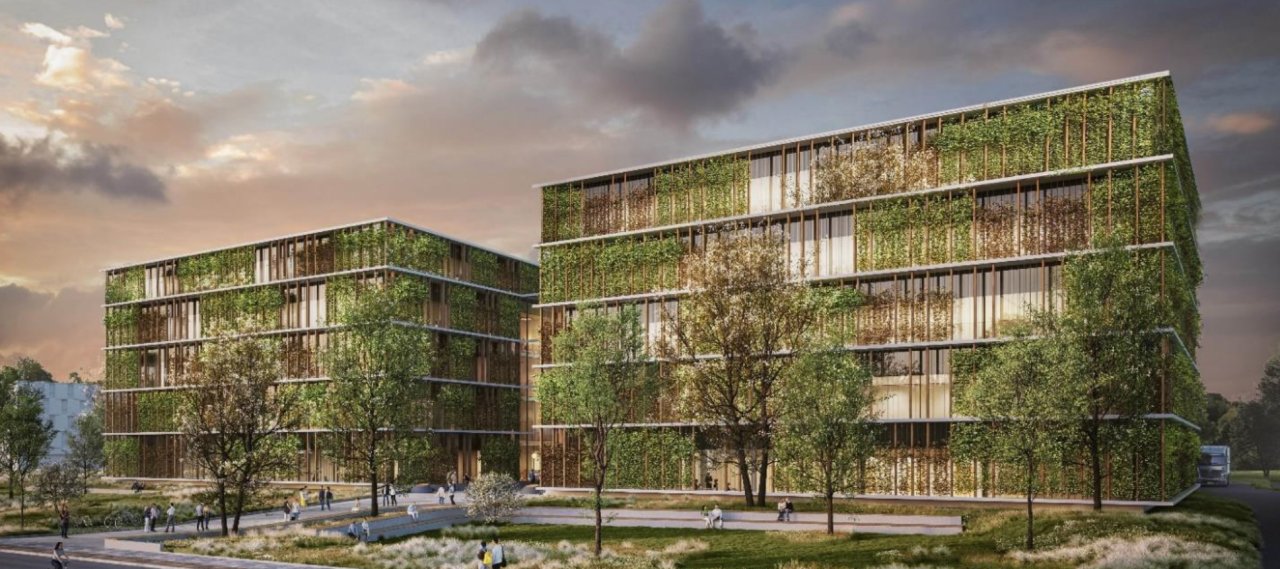 The new building is designed for research and teaching. It consists of four identical cubes connected by a shared foyer. The central part of the building is a two-storey lecture hall located above the basement and ground floor. Public areas will be located on the ground level, while the three upper floors will mainly house laboratories, practical rooms, and office space. The building will end with a technical floor, which will be enclosed and roofed to create an additional upper floor.